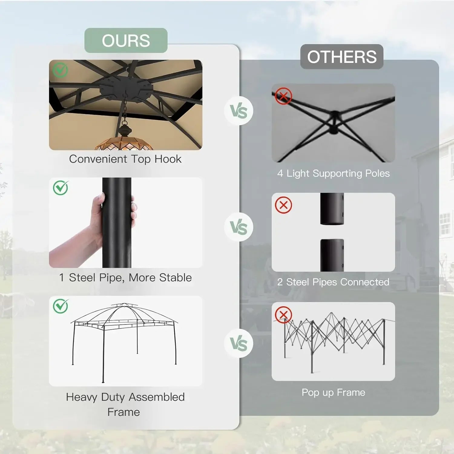 - Dual-Layer Roof Design: The unique double-layer roof structure provides good ventilation and helps better resist wind. The top mesh design enhances air circulation, reduces heat buildup, and improves the comfort of the outdoor pergola, backyard gazebo also includes hooks for hanging fans, lights, or decorations, giving you the flexibility to personalize your outdoor space
