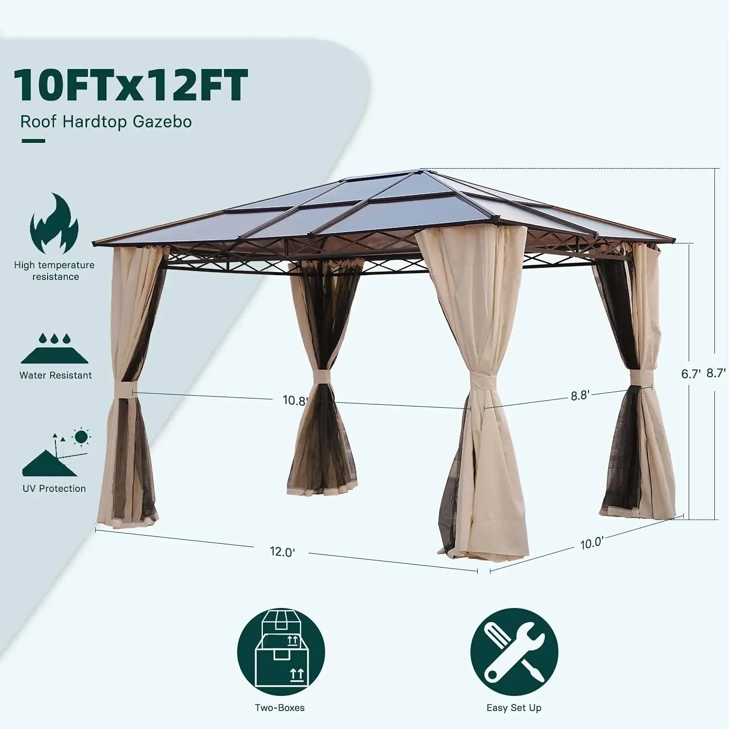 10x12 Gazebo, Hardtop Gazebo, UV 50+ Netting and Curtains