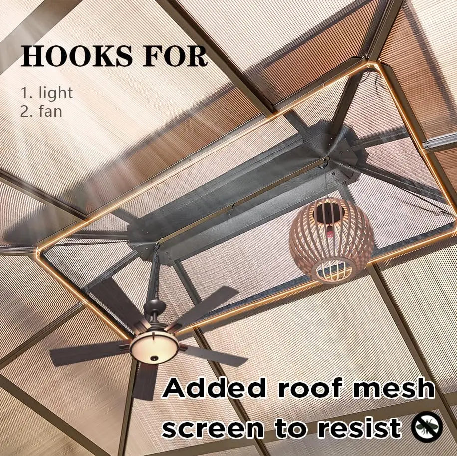 - 𝗜𝗡𝗖𝗟𝗨𝗗𝗘 𝗠𝗘𝗦𝗛 𝗖𝗨𝗥𝗧𝗔𝗜𝗡𝗦 & 𝗣𝗥𝗜𝗩𝗔𝗖𝗬 𝗖𝗨𝗥𝗧𝗔𝗜𝗡𝗦: The hardtop gazebo comes with a double-track system for easy sliding. Removable curtains ensure UV and rain protection, while the equipped mesh curtain with zipper keeps good ventilation. Let you enjoy great privacy while having full airflow and a wide view of the outdoors