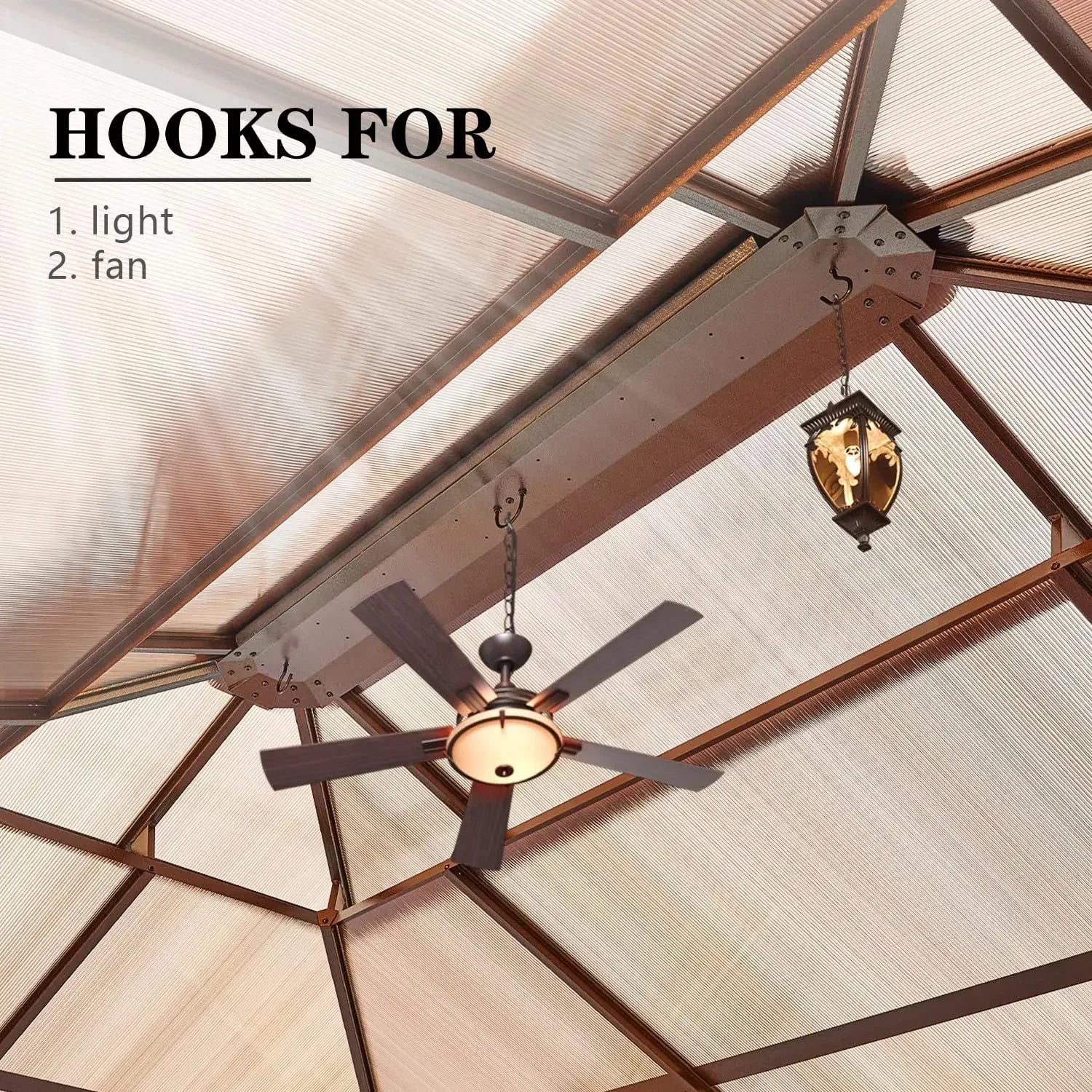 - DOUBLE TOP DESIGN: For fuller protection and fresher air, our patio gazebo features a ventilated, double-layer polycarbonate roof. It prevents harmful UV rays while allowing air circulation and helps withstand wind. You can sunbathe under this pavilion without worrying about getting sunburned. *Please note that the polycarbonate roof can only block UV rays, not high temperatures and strong light