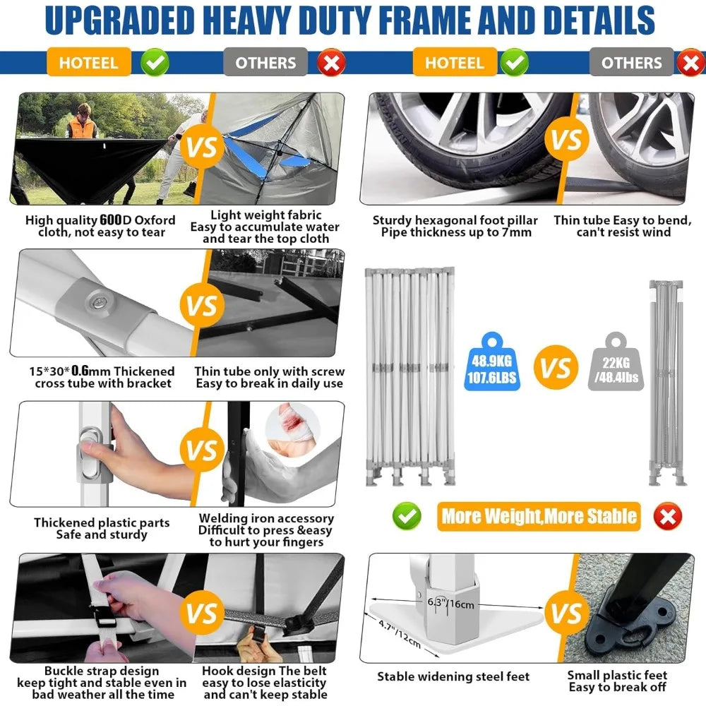 - šćšš©š š«šššš ššššÆš² šš®šš² ššØš§š¬šš«š®ššš¢šØš§ & šš©š š«šššš šš¢š§šš©š«šØšØšć HOTEEL 10x30 canopy tent heavy duty frame is made of upgraded heavy duty bracket. The 8 solid legs are consists of 45*35*0.7mm unique hexagonal poles, plus with 15*30*0.5mm thickened cross tube bracket, both provide enough sturdiness and stability for this party tent. This strong structure can hang 11 adults easily, even withstand 10.7 m/s winds while other canopy only withstand 5 m/s winds.
