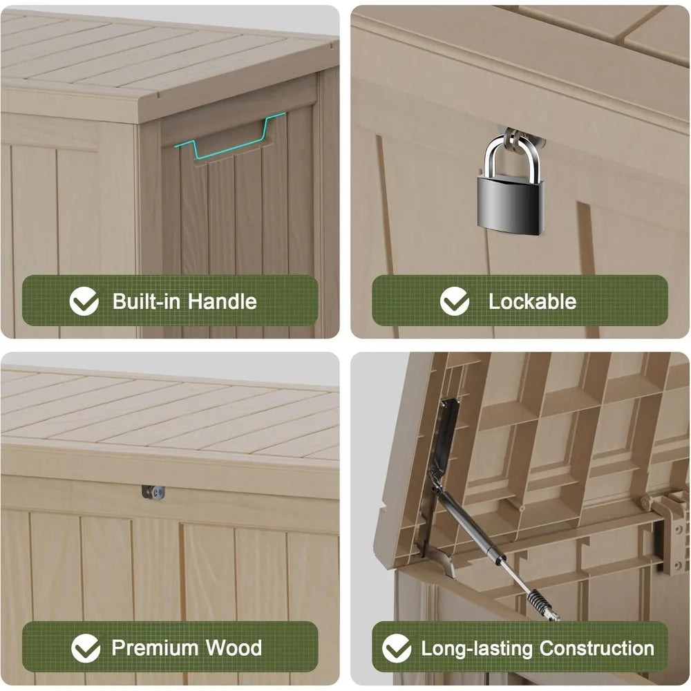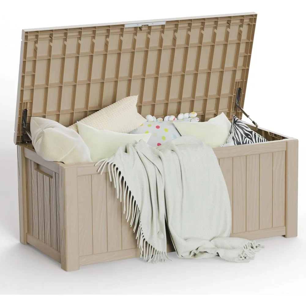 This versatile patio storage box is designed to accommodate a variety of settings, from indoor laundry storage to outdoor deck boxes for items such as cushions, garden tools, and pool accessories. It can also function as a side table, yard seat, storage bench, or footrest, making it a multi-purpose addition to your space. Built with durability in mind, this outdoor deck box boasts an all-weather design that combines an aggregate resin and wood grain pattern, ensuring it withstands water, UV rays, fading, rust, peeling, and warping with minimal maintenance required. For ease of use, the deck storage box features built-in handles on both sides, facilitating easy lifting and movement. Additionally, it offers the option to install a password lock or small lock (not included) on the top cover for added security. Assembly is hassle-free with the outdoor storage box's clip design, allowing a single person to put all panels together without any tools needed. With a 120 Gallon capacity and dimensions of 54.25"L x 26.5"W x 24.21"H, this outdoor deck box is an ideal solution for small item storage, providing convenience and practicality.