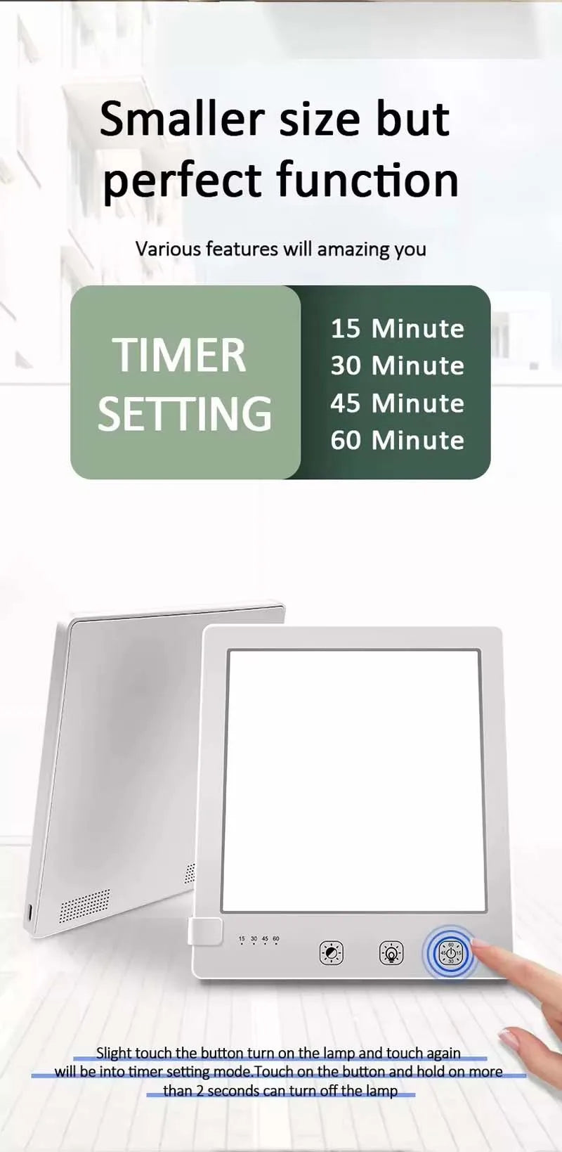 *3 Temperature Lights: We make this sun lamp 3000k-6500k color temperature - 3 light colors including White,Natural and Warm light for your different needs. Simply finger touch the button, you are ready to fully enjoy your wonderful time.