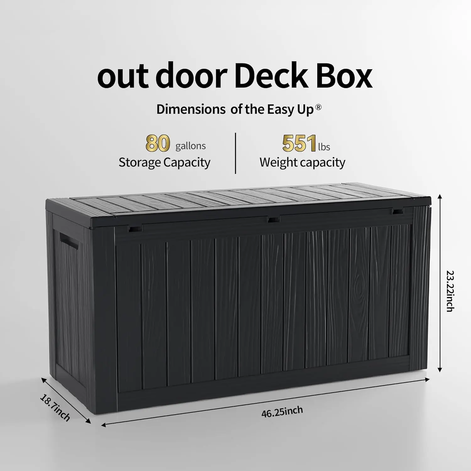 - Large Capacity: This 80 gallon deck box offers ample storage space for your outdoor accessories, and it has a 550-pound weight capacity and can be used as a separate patio seat or indoor table.