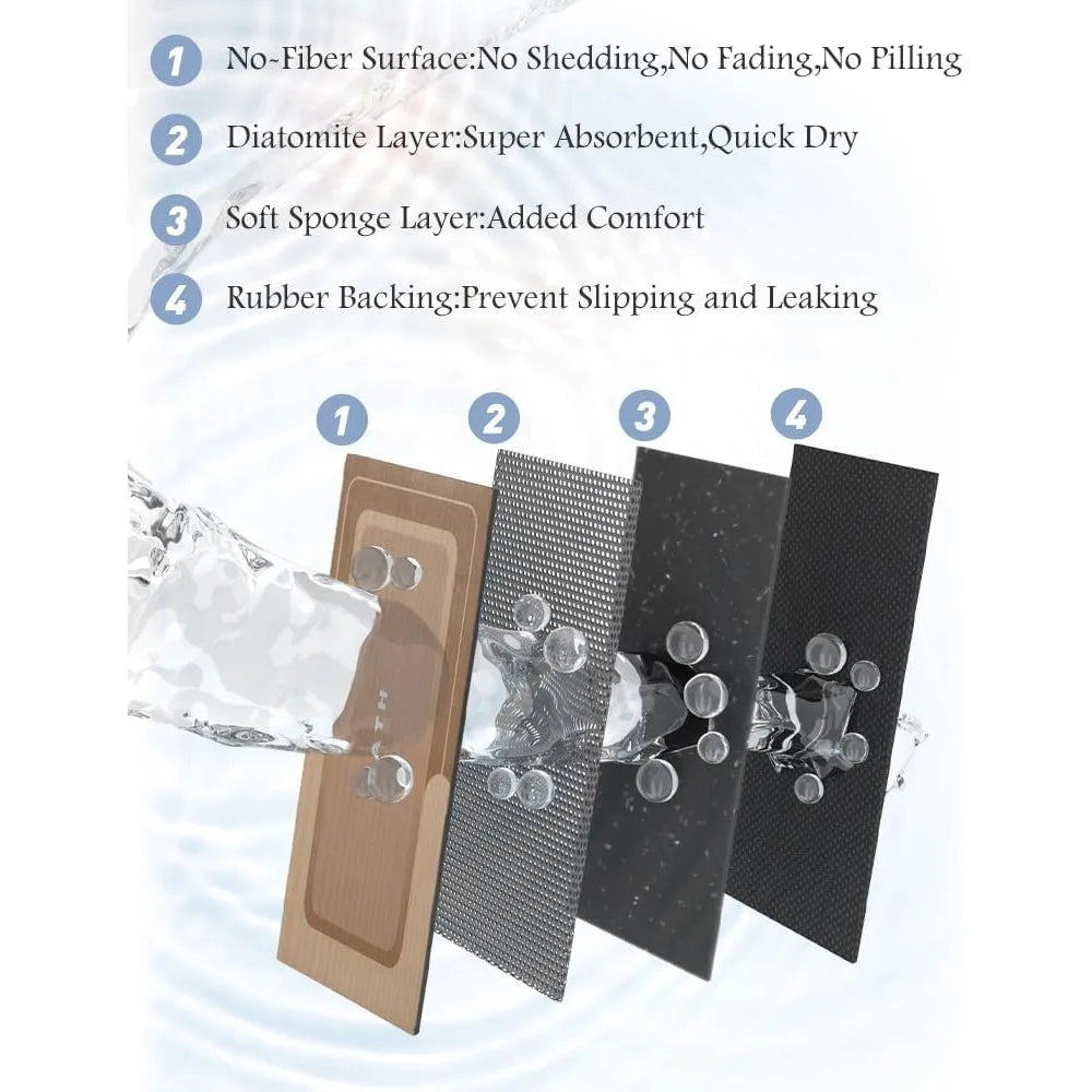 This luxurious bath mat offers a perfect combination of comfort, functionality, and innovation. It features a smooth, leather-like surface that is easy to maintain, a cushioning sponge layer for added comfort, a super absorbent and quick-drying soft diatomaceous earth layer, and a durable rubber backing for stability. The bath mat's nano-porous surface is designed to instantly absorb water, leaving no visible watermarks or stains. It is highly absorbent and stain-resistant, making it a reliable choice for keeping your bathroom clean and safe after showers or hand washing. Maintenance is simple with the stain-resistant surface, which is ideal for households with pets. A quick wipe or rinse will make the bath mat look brand new. The mat's numerous tiny pores allow for rapid water evaporation, making watermarks disappear within minutes, ensuring it is not too damp for the next user. The rubber backing provides excellent skid-resistance, making the bath mat non-slip even on wet floors. It also prevents water from seeping underneath and spreading, keeping the mat odor-free even when wet for extended periods. Durability and user-friendliness are key features of this bath mat. It resists pilling, fading, and shedding, setting it apart from traditional microfiber bath mats. The thin design minimizes tripping hazards and allows for easy passage for doors or wheels. Choose from a variety of sizes, including small bath mats (17"x27", 17"x35") and long bathroom runners (17"x50", 17"x59", 17"x70").