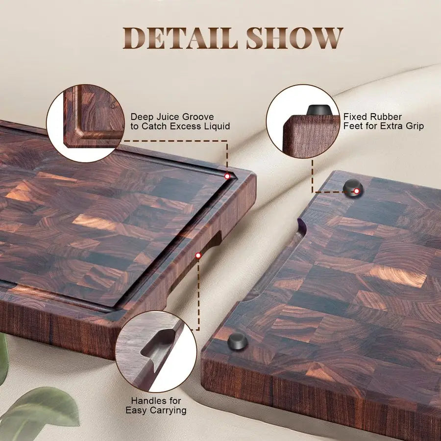 End Grain Cutting Board Premium Black Walnut Wood Cutting Wood Boards are crafted with end grain construction, a type of construction that is extremely durable and can withstand heavy felling and with the Black Walnut Cutting Board being gentle on your loving knives, you get the best of both worlds, a sharp knife and a gorgeous cutting board.