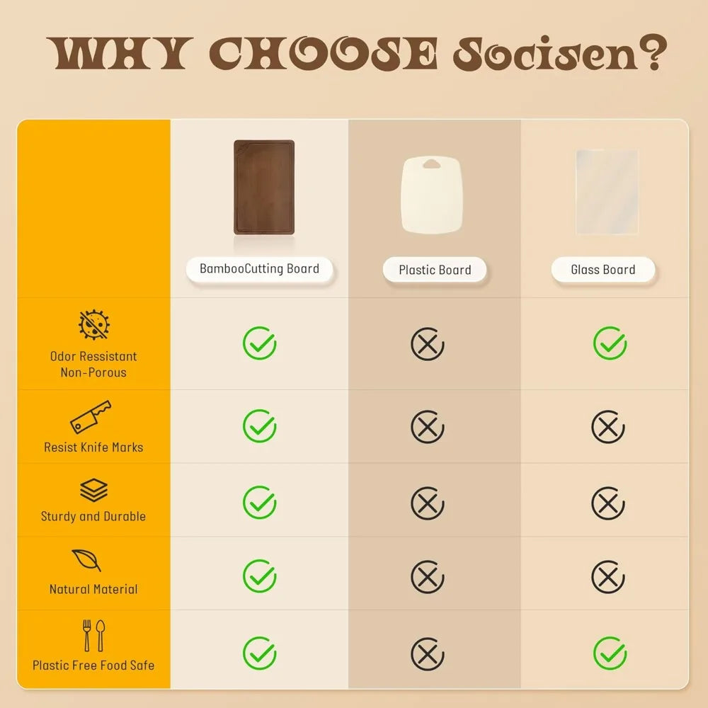 - Thoughtful Design with Handles and Juice Grooves - For effortless transportation and added convenience, our bamboo cutting board feature built-in handles on the sides, allowing you to move your cutting station with ease. The deep juice grooves around the edges catch excess liquids from meats and fruits, keeping your countertop clean and tidy. These thoughtful design elements make our wood board not only functional but also a breeze to clean up, ensuring a neat and tidy kitchen space.