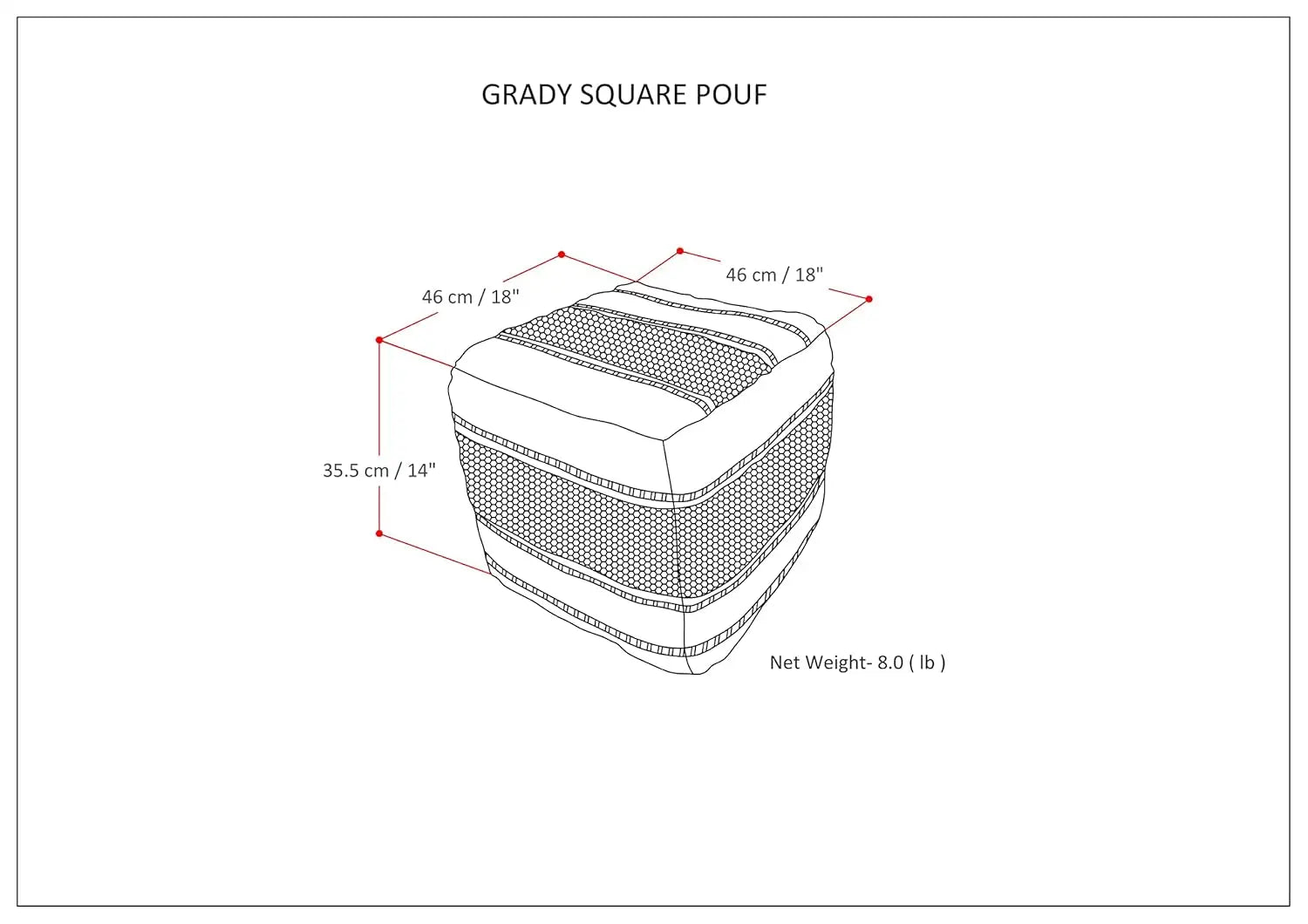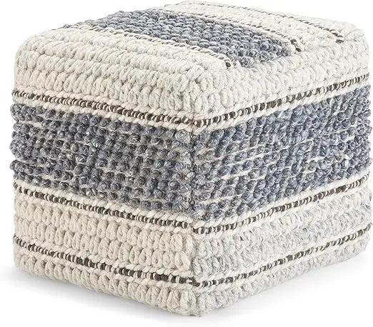 This item is a handcrafted piece of furniture, featuring a woven blue and natural pattern made from wool and cotton. It boasts sturdy construction with dense polystyrene bead filling that maintains its shape and provides excellent support. Measuring 18 inches in diameter, 18 inches in width, and 14 inches in height, this multi-functional piece can serve various purposes in your living room, family room, or bedroom. It can be used as a foot stool, accent furniture, or additional seating. The versatile square shape is accentuated by the trendy handloom woven detail on both the top and sides.