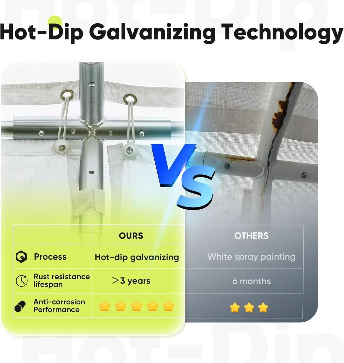 - 【Sturdy Steel Frame】Our Party Tent Features A High-quality, Heavy-duty 38mm White Powder-coated Galvanized Steel Tube Frame That is Corrosion-resistant. With a Steel Tube Diameter of 1.5 Inches (38 mm) And Metal Connector Diameter of 1.66 inches (42 mm), You Can Be Sure Of Strong Support.