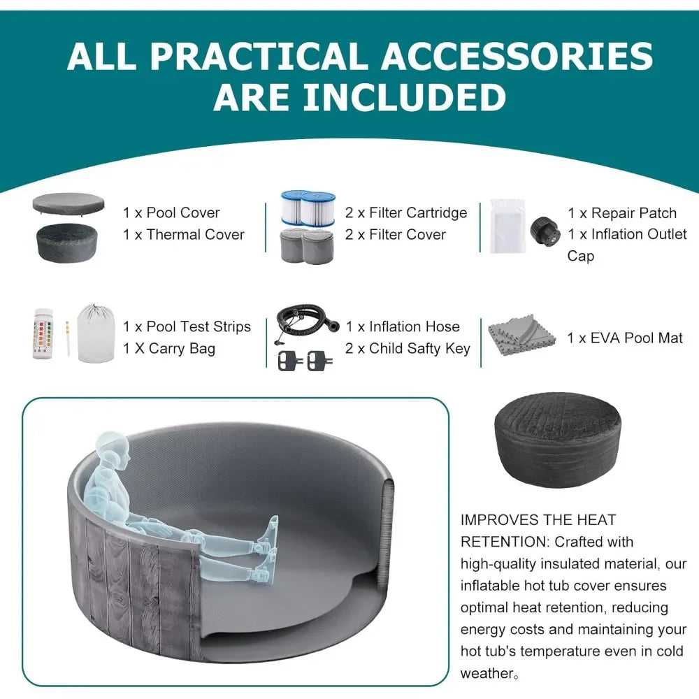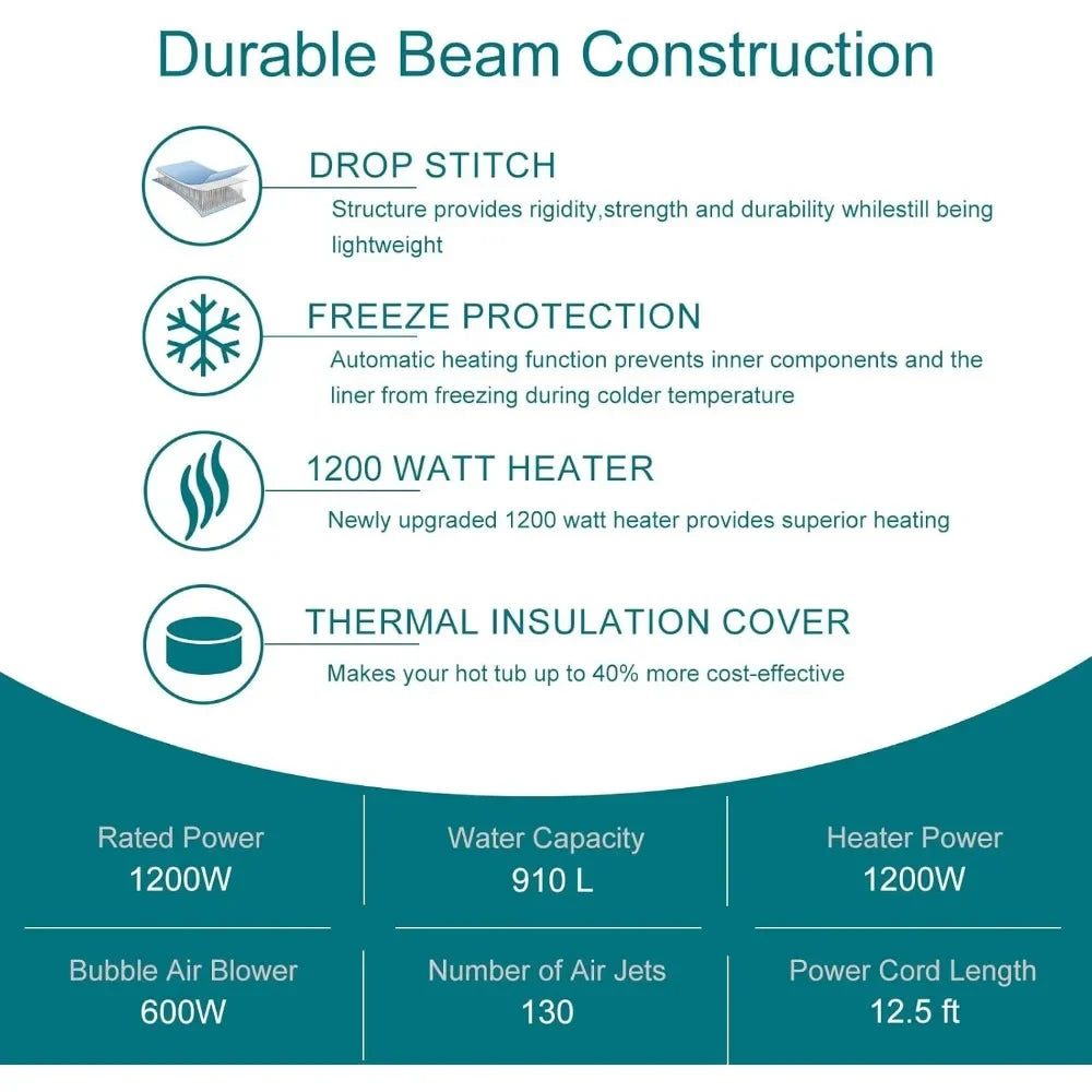 - HOT TUB WITH BUBBLE MASSAGE: The inflatable hot tub is made for up to 4-6 people and heats up to a soothing 104℉ with 130 surrounding powerful air bubbles, built-in integrated water filtration system to keep the water clean. Durable laminated PVC inflated walls for durability and comfort