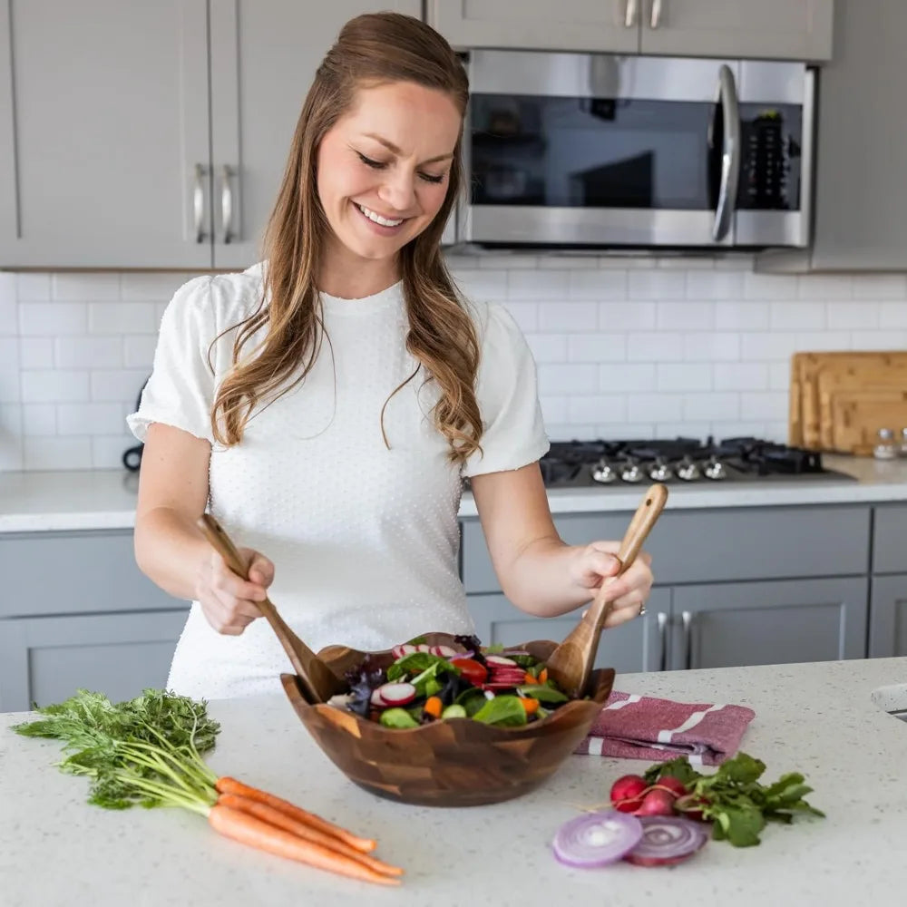 Discover the perfect blend of style and functionality with our handcrafted acacia wood salad bowl set. This large decorative bowl is designed to elevate your kitchen and home decor while offering versatile use for everyday needs. Key Features: - Versatile Serving and Decor: Use this scalloped bowl to stylishly serve salads, pasta, or fruit. It also doubles as a decorative piece for organizing keys, sunglasses, or bathroom essentials, adding a rustic charm to any room. - Durable Acacia Wood Construction: Made from high-quality acacia wood that resists cracks and stains. It withstands temperature changes and humidity without splitting, ensuring long-lasting beauty even when exposed to tomato sauce or berries. - Unique Scalloped Rim Design: Stand out from kplain wooden bowls with our aesthetic hand-carved wavy edge. This detail showcases true craftsmanship and adds a distinctive farmhouse touch to your table setting. - Safe Food-Grade Finishing: Coated with a natural oil that protects the wood without infusing harmful chemicals into your food. The finish remains intact over time, even after multiple washes, making it safe for serving meals directly. - Complete Set with Spoons: Includes two 10-inch handcrafted wood spoons made from the same premium acacia wood as the bowl. No need to purchase utensils separately; everything you need is in one convenient package. Ideal Uses: - Perfect for serving salads, pasta, snacks, or fruit at family gatherings or parties. - Great as a decorative centerpiece on countertops or dining tables. - Useful for organizing small items in entryways or bathrooms. Care Instructions: To maintain its beauty, hand wash gently with mild soap and water. Avoid soaking in water or using harsh chemicals. Dry thoroughly after each use to prevent moisture damage. Why Choose Our Product? Our commitment to quality ensures you receive a durable and stylish addition to your kitchen. The natural materials and handcrafted details make it an eco-friendly choice that enhances any home decor theme.