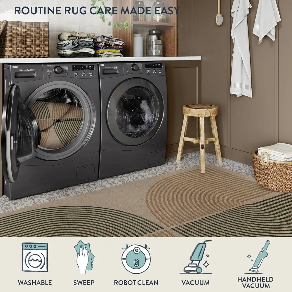 This product features a durable and stylish rug that mimics the appearance of natural jute but is actually made from safe polyester. It is designed to be long-lasting, resistant to cracking, scratching, shedding, and fraying over time. The rug boasts a modern rainbow design with a combination of lines and half circles, creating a double rainbow texture that adds a contemporary touch to any room and complements various spaces. The rug is equipped with a non-slip TPE backing, which helps to keep it in place on the kitchen floor, enhancing safety for the family. It is safe for home use and recommended to be placed on a clean and dry floor. It is easy to clean, as it can be swept, vacuumed, or hosed down to remove dust and debris. For a deeper clean, it can be washed in cold water on a gentle cycle and should be air-dried after machine washing. Please note that the rug is shipped folded and may have some creases initially. To remove these, unroll the rug or place heavy books on it for a few days. Be aware that pet claws might catch on the threads of the woven rug.