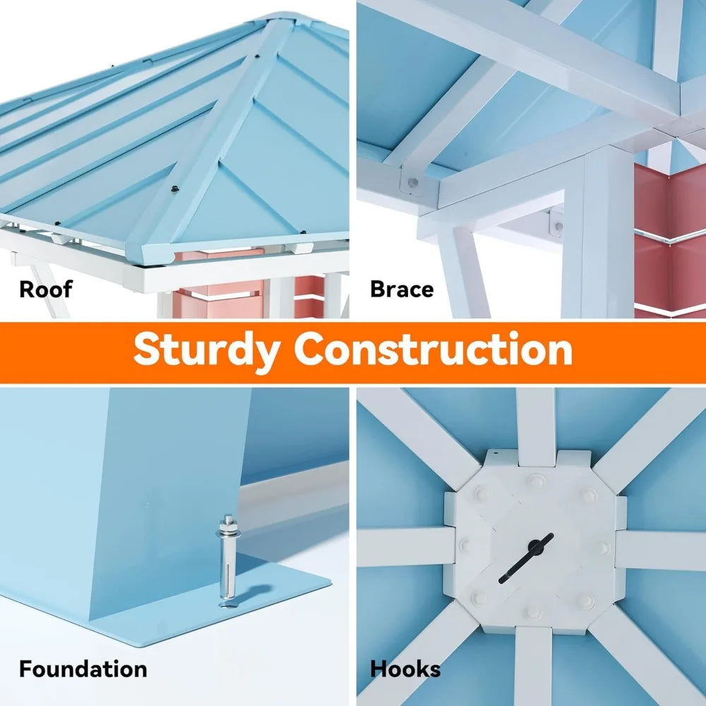 - [STURDY FIXTURES] The gazebo pavilion is equipped with sturdy hooks on the roof, perfect for hanging lights and fans, enhancing the ambiance of your coastal-inspired steel gazebo and creating a delightful outdoor retreat.