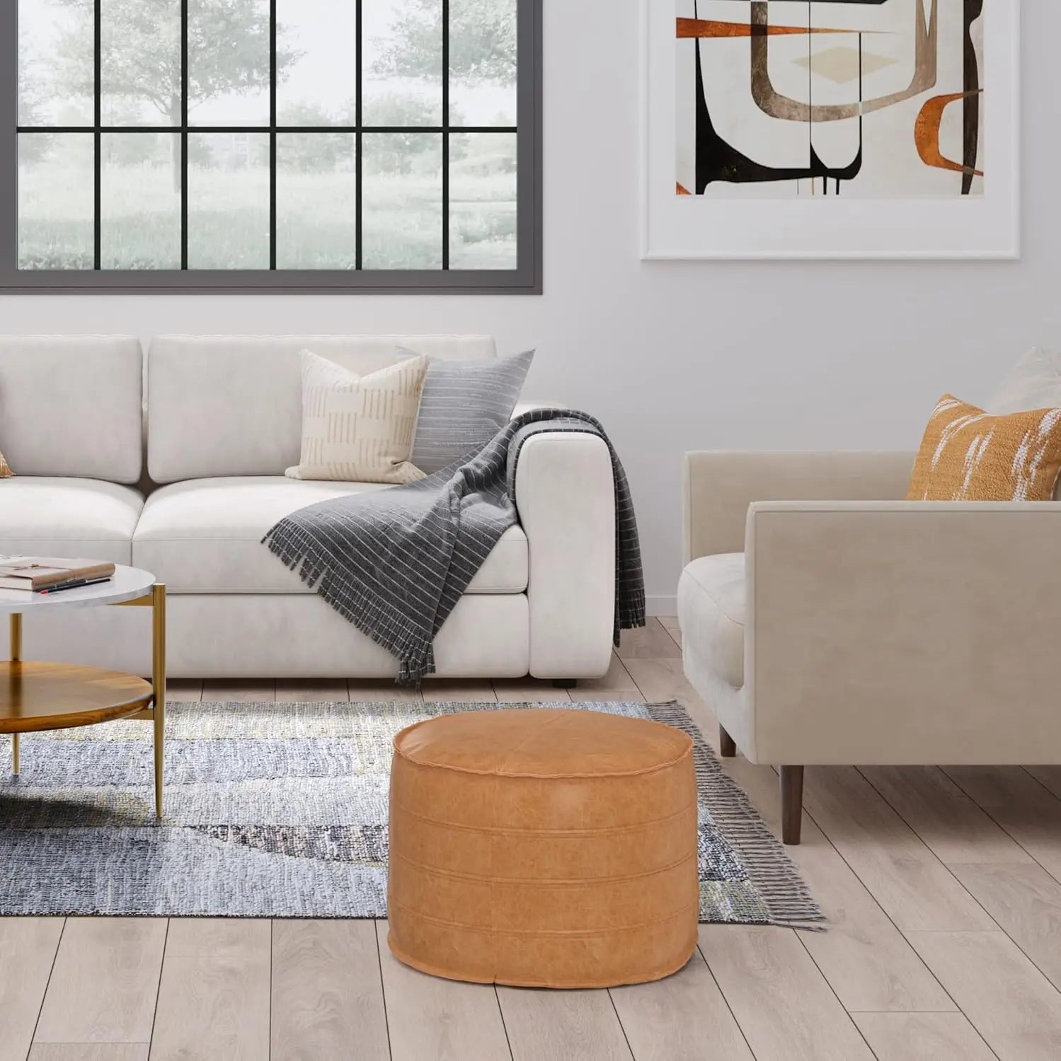 Brody Boho Round Pouf In Distressed Brown Vegan Faux Leather For The Living Room, Bedroom And Kids Room