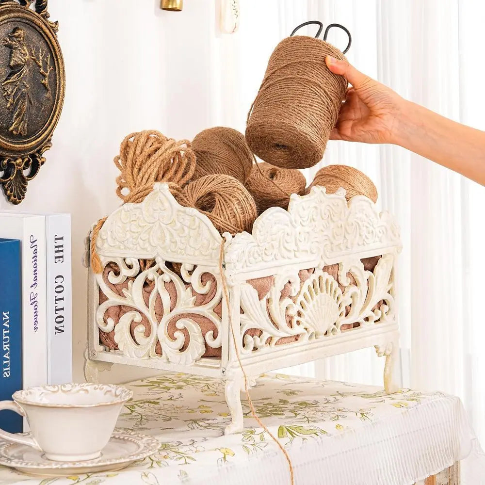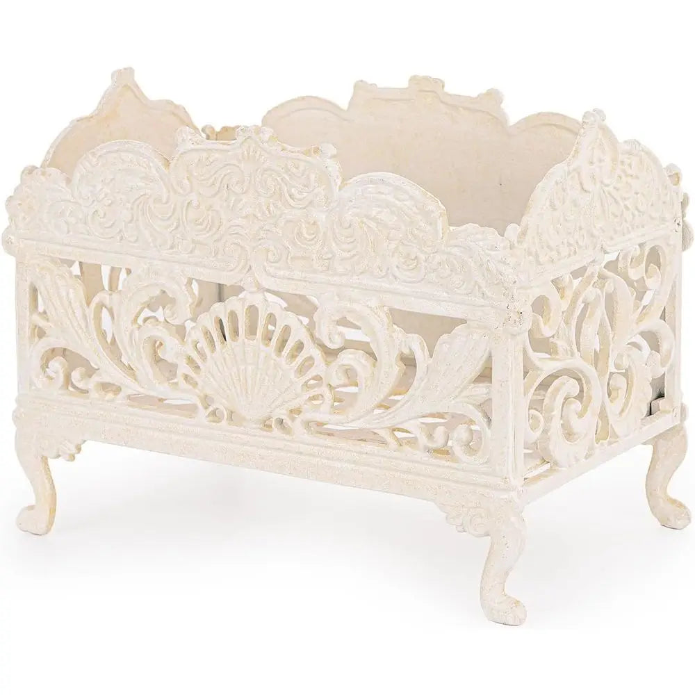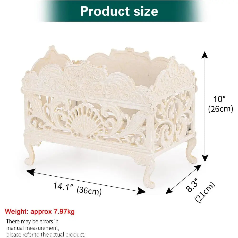 Color: Antique White Material: Iron Product Dimensions: 14.2 inches long by 8.3 inches wide by 10.2 inches high Water Resistance Level: Water Resistant This elegant vintage design storage basket is hand-crafted from cast iron, featuring ornate scrollwork and an antique finish that adds a timeless charm to any kitchen or home. The basket is durable and heavy-duty, made from solid cast iron with a protective powder-coated surface, ensuring it will last for years of everyday use. The multi-purpose organizer is perfect for storing kitchen towels, napkins, utensils, condiments, fruits, or decorative items. It is versatile for use on countertops or dining tables. This basket combines practicality with classic style, keeping kitchen essentials neatly organized while also serving as a beautiful accent piece. It is suitable for both indoor and outdoor use, making it ideal for home kitchens and patios. It can also be used as a decorative planter, magazine rack, or towel holder. The dimensions of the basket are 14.2 inches in length, 8.3 inches in width, and 10.2 inches in height.