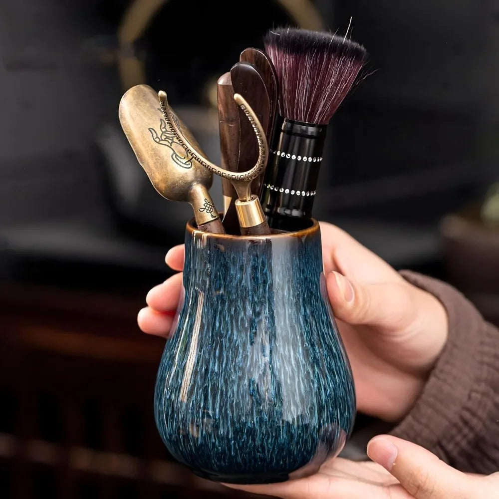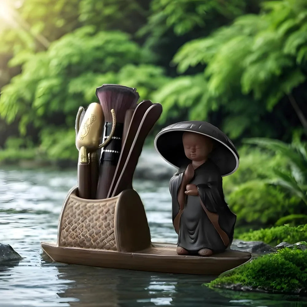 - •【Tea Ceremony Zen Tea Ritual Set】This curated trio combines cultural artistry with functional design: The boat-shaped tea caddy organizes six tea tools in Zen-inspired compartments, The ceramic monk tea pet develops a tea-nurtured patina, embodying mindfulness; and the douli tea strainer filters leaves with rustic charm. Together, they transform tea rituals into meditative experiences, blending practical elegance with symbolic craftsmanship rooted in riverside tea traditions